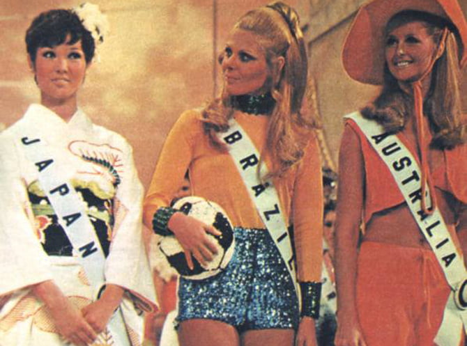 Eliane Thompson, Miss Brasil de 1970, entre as misses Japão e Austrália, com o traje típico que homenageou Pelé no Miss Universo (Foto: Manchete)