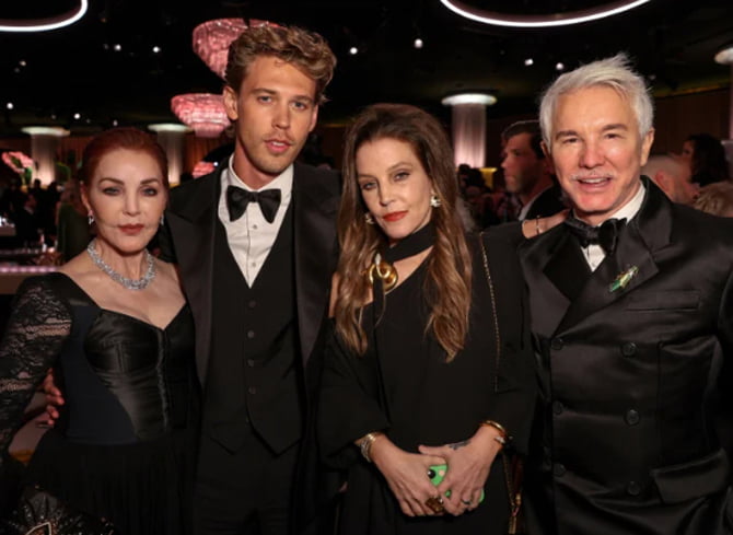 Priscilla Presley, Austin Butler, Lisa Presley (ultima festa que compareceu, Globo de Ouro), e Baz Luhrmann (Foto: Divulgação)