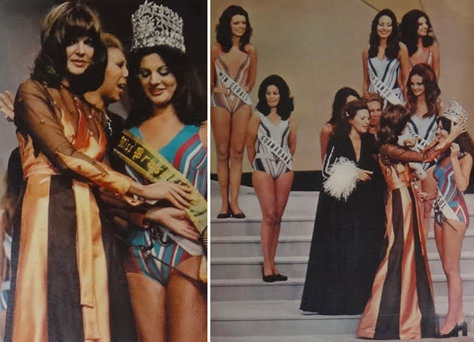 Dois momentos da coroação: Eliane passando a faixa e a coroa para Rejane (Fotos: Manchete)