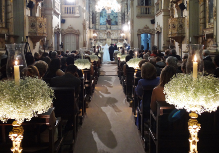 A Ordem Terceira de São Francisco inaugurada em 1804, continua linda. A decoração apenas acentuou ainda mais a beleza do local. Tita Medeiros sabiamente apenas colocou arranjos de gypsophilas, desde a nave central até o altar mor. Lá do teto da Igreja caia um lustre de Bacarat belíssimo, acho que do século XIX. Pois bem, foi nesse set de filme hollyodiano que Dom Marcelo, abençoou o casamento de Renata, filha de Sandra de Albuquerque Rocha e José Antônio Moreira Alexandre com Alexandre, filho de Maria Adélia e Carlos José de Sá Pereira.