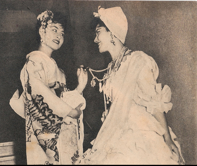 Hisako Okuse conversa com Sônia Maria Campos sobre os adereços da baiana (Foto: O Cruzeiro)