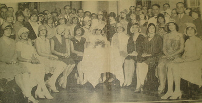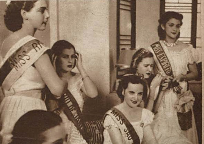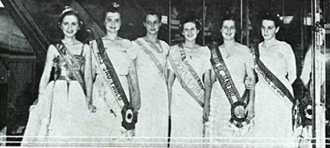 Misses Esilda Lisboa (RS), Neyde Tinoco Estado do Rio), Cleide Escobar (SP) e Maria Batista Fernandes (ES) no Cassino da Urca onde aconteceu o Miss Brasil de 1939 (Foto: Revista Malho)